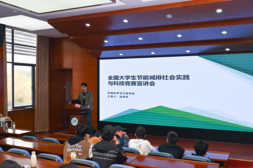 刘润东主要从全国大学生节能减排社会实践与科技竞赛的组织形式、参赛流程、专业知识、经验分享等内容进行深入宣讲。