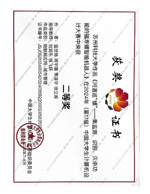 刘润东老师、钱飞跃老师指导,学生温世炀、周宇璐、季泽宇、徐立阁共同完成的作品《生态巡“螺”——集监测、识别、灭杀功能的福寿螺智能机器人》荣获物联网应用和数媒动漫与短片类别全国二等奖。