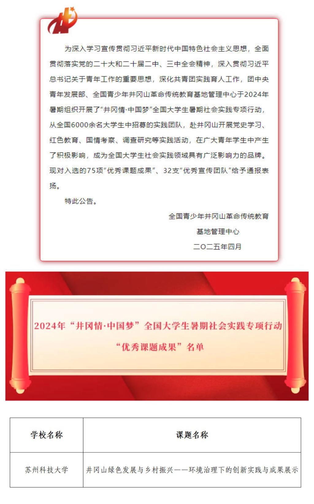 “红色井冈 绿色希望”实践团的《井冈山绿色发展与乡村振兴——环境治理下的创新实践与成果展示》获评优秀课题成果,全国共75件作品获此荣誉。