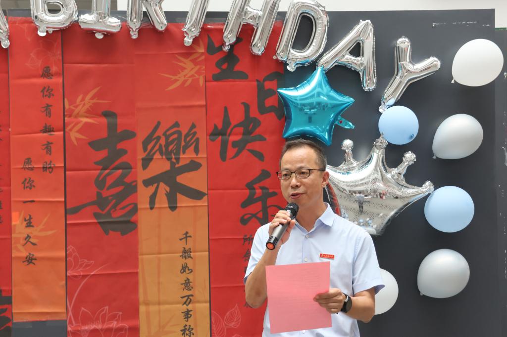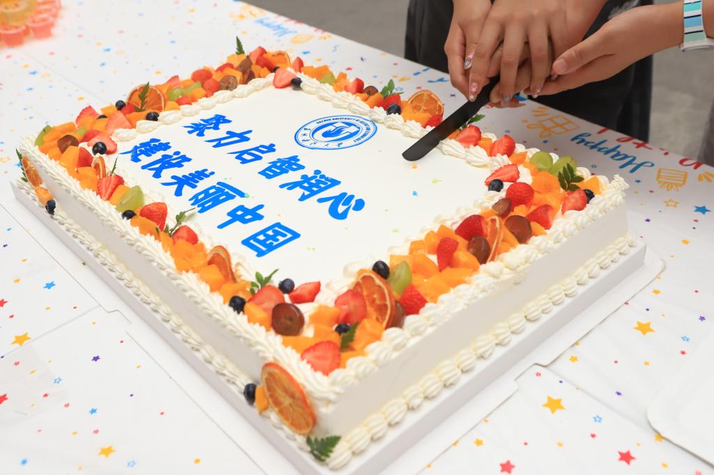 党委书记潘杨致辞,向过生日的师生致以祝福,并鼓励新同学们珍惜大学时光,脚踏实地、勤勉奋进。学生处副处长陈琰与新生代表朱睿琦一同为大家切分蛋糕。商学院新生李良作为代表发言,他表示报道第一天与老师、同学们共庆生日,倍感温暖,期待在这个有爱的大家庭中踏实学习、不断成长,度过充实而有意义的大学时光。