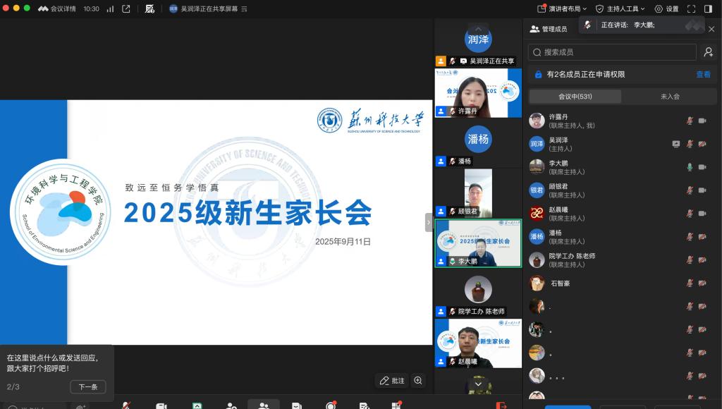 组织了2025级新生线上家长会。学院党委书记潘杨、院长李大鹏,学院党委副书记顾银君,学工办主任陈一重,新生辅导员和全体2025级新生家长出席本次家长会,新生家长会由顾银君主持。