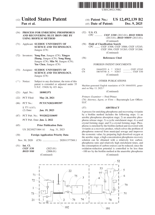 废水低碳处理与资源化团队申请的国际发明专利“PROCESS FOR ENRICHING PHOSPHORUS AND RECOVERING BLUE IRON ORE BY USING BIOFILM METHOD”(生物膜富集磷及回收蓝铁矿的方法)喜获美国发明专利授权(授权号:US12492139B2)。此次获批授权表明轻小说