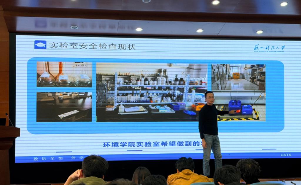 会上,学院实验室安全管理员唐毅老师通报了近期学院实验室安全专项检查情况,针对检查中发现的实验操作不规范、试剂存放不合理、安全防护不到位等问题进行详细说明,明确整改要求与时限,强调实验室安全无小事,全体学生需高度重视细节问题,杜绝安全隐患。随后,结合近期国内实验室发生的安全事故典型案例,从危险化学品使用、仪器设备操作、用电用火安全、应急处置流程等方面展开专题培训,深入剖析事故发生的原因与教训,让同学们直观认识到实验室安全的重要性和违规操作的危害性。