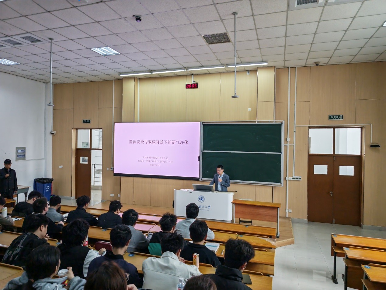 邀请苏州科特环保股份有限公司技术总监、学院优秀校友杨海亮高级工程师走进《大气污染控制工程》课程,在石湖校区C5-201为环境工程专业23级的百余学生带来题为《能源安全与双碳背景下的沼气净化技术》的专题授课。