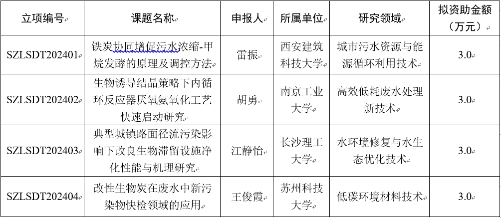 )学术委员会评审,通过综合考察申请人学术水平与潜力、申请课题对苏州绿色低碳水处理与资源化利用技术的需求度,以及与本实验室研究发展方向的契合度,现确定2024年度拟立项资助开放课题4项,具体立项课题名称及资助额度清单附后。