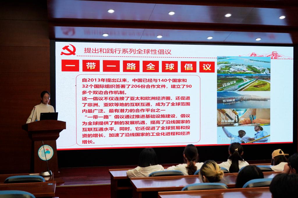 主讲人张又巾从“推动构建人类命运共同体,为解答时代之问、世界之问贡献中国方案”、“推动构建新型国际关系,深化拓展平等、开放、合作的全球伙伴关系网络”、“提出和践行系列全球性倡议,为人类和平与发展的崇高事业贡献中国力量”三个部分,详细讲述了新中国成立75周年外交成就。学习过程中,同学们认真听讲,积极回答,相互交流,深刻认识到以习近平同志为核心的党中央,统筹中华民族伟大复兴战略全局和世界百年未有之大变局,全面推进中国特色大国外交,推动构建人类命运共同体,中国外交取得新的举世瞩目的成就,中国国际影响力、感召力、塑造力显著提升。