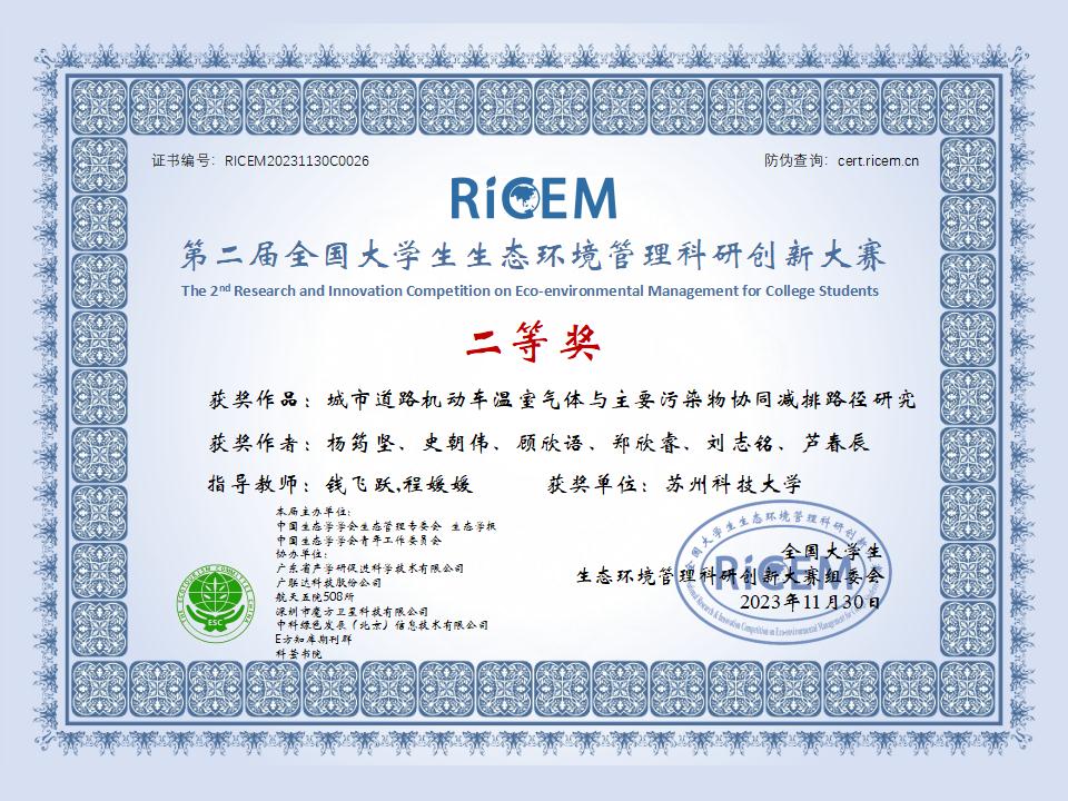 环境类专业本科生杨筠坚、史朝伟、顾欣语等6人完成的作品“城市道路机动车温室气体与主要污染物协同减排路径研究”,在第二届全国大学生生态环境管理科研创新大赛中荣获二等奖,团队指导教师为钱飞跃、程媛媛副教授。