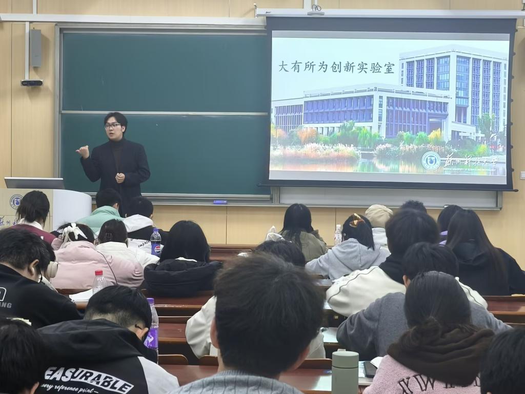 第三阶段,系列活动迎来学科竞赛专场。科研团队代表徐立阁带来精彩分享。他以实验室发展脉络为线索,生动讲述了团队从探索方向、攻克瓶颈到取得突破的科研历程,结合自身参与的项目案例,用通俗易懂的语言拆解科研逻辑,有效消除了新生对科研的陌生感。徐立阁鼓励大家可以带着好奇心走进科研,将课堂知识与实践深度融合,还详细介绍了实验室的研究方向、开放项目及招新要求,诚挚邀请新生加入团队共同成长。在互动环节中,新生围绕“零基础能否加入实验室”以及“科研与学业如何兼顾”等问题开展深入交流,现场气氛活跃。